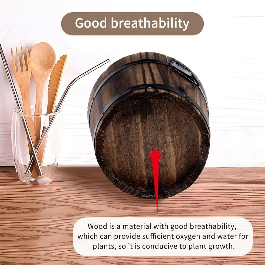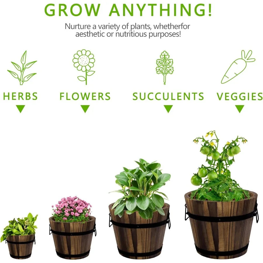 4 Pack Wooden Whiskey Barrel Planters bring rustic charm to your home or garden with four sizes in one convenient set. Perfect for herbs, flowers, or small decorative plants, these wooden bucket barrel planters create a cohesive, vintage-inspired display.