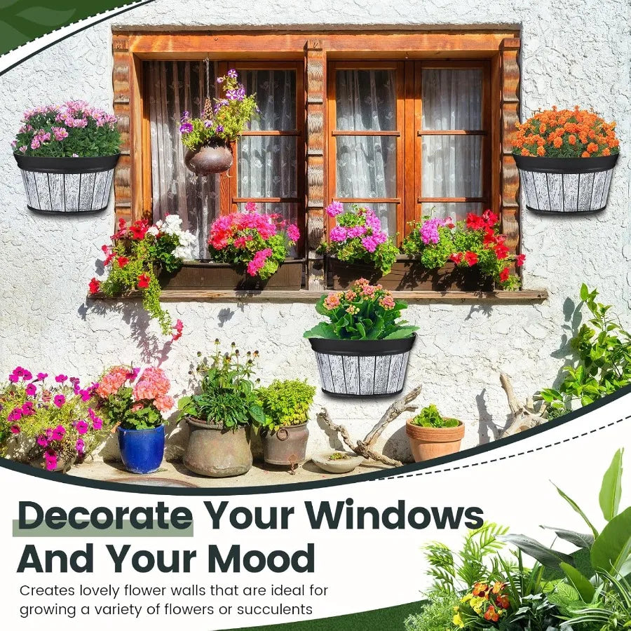 Layhit 6 Pcs Wall Hanging Planters are a rustic, space-saving solution for outdoor spaces, designed for anyone who loves greenery on vertical walls. This set combines a wine barrel style with a distressed oak finish and a durable thickened plastic body with water storage features for easier plant care.