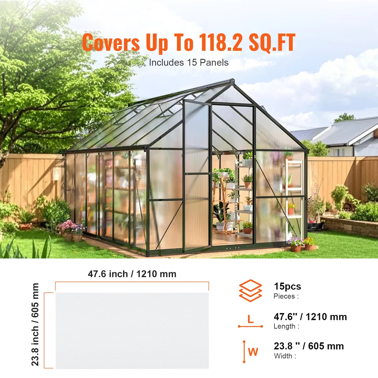 These polycarbonate roof panels offer strong impact resistance and durability to extend the life of your greenhouse. UV protection helps shield plants from harsh rays while still delivering ample light for healthy growth. The corrugated design enhances rigidity and promotes efficient rain runoff, while the lightweight construction simplifies handling and installation. With 15 panels, you can cover a substantial area and maintain a clear, bright growing environment throughout the seasons.